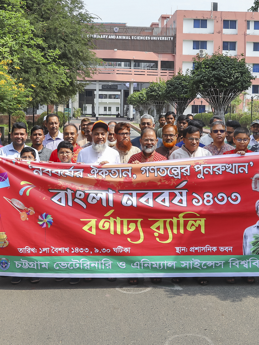 আজ ১৪ এপ্রিল মঙ্গলবার চট্টগ্রাম ভেটেরিনারি ও এনিম্যাল সাইন্সেস বিশ্ববিদ্যালয়ে (সিভাসু) উদযাপন করা হয়েছে বাঙালির ঐতিহ্যবাহী উৎসব বাংলা নববর্ষ ১৪৩৩। ‘নববর্ষের ঐকতান, গণতন্ত্রের পুনরুত্থান’ এই প্রতিপাদ্যে সকাল সাড়ে ৯টায় বিশ্ববিদ্যালয়ের প্রশাসনিক ভবনের সামনে থেকে বের করা হয় বর্ণাঢ্য শোভাযাত্রা।